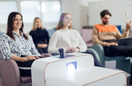 Unabhängig von der Größe des Publikums eignet sich Artome M10 für eine klare Kommunikation für alle im Raum. Die Bildgröße wächst, indem man den Artome M10 etwas weiter von der Wand wegbewegt. Der in den intelligenten Möbeln verwendete Kurzdistanz-Laserprojektor von Epson kann aus der Nähe des Anzeigebereichs projizieren, sodass der Projektor für eine maximale Bildgröße (bis zu 150 Zoll) nicht einmal so weit von der Wand entfernt sein muss.