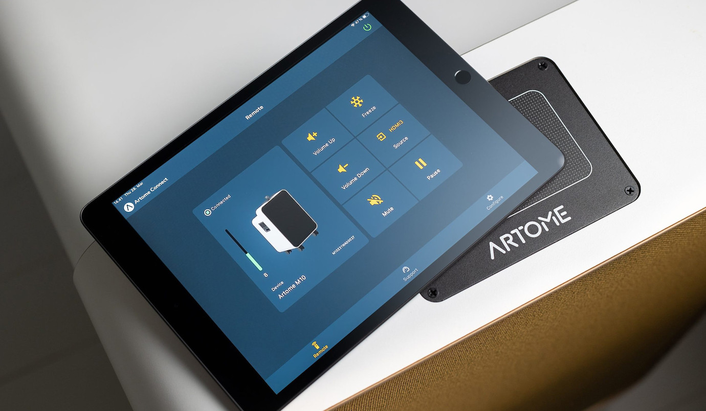 Die Bedienung ist dabei intuitiv gestaltet. Über das integrierte Bedienfeld steuern Sie Funktionen wie Lautstärke, Quellenwahl oder das Einfrieren des Bildes ("Freeze"). Für noch mehr Komfort sorgt die Artome Connect App, die Ihr Tablet in eine drahtlose Fernbedienung verwandelt, sowie die beiliegende Bluetooth-Fernbedienung. So behalten Referenten oder Lehrkräfte die volle Kontrolle, egal wo sie sich im Raum befinden.