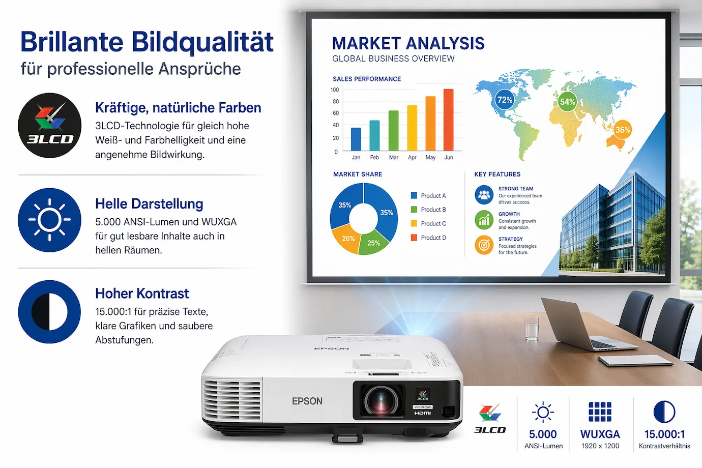 - Helle Darstellung: 5.000 ANSI-Lumen und WUXGA für gut lesbare Inhalte auch in hellen Räumen.