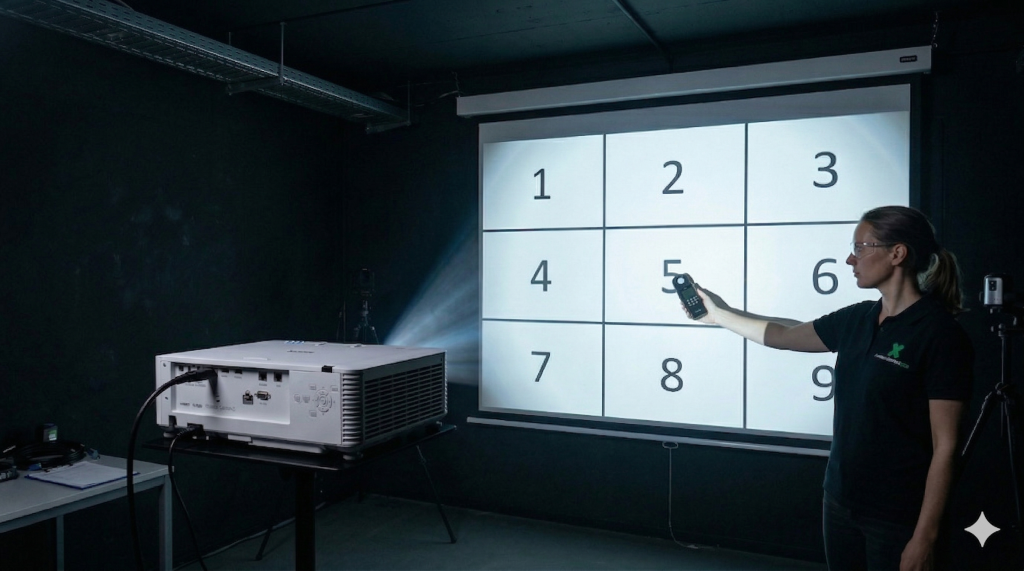 So wird gemessen: Die Helligkeit wird an neun definierten Punkten in einem 3×3-Raster auf einer weißen Projektionsfläche gemessen. Der Durchschnittswert dieser neun Felder ergibt den ANSI-Lumen-Wert. Die Messung findet in einem kontrollierten, völlig dunklen Raum bei 25 °C an einem einzelnen Gerät statt. Das Ergebnis ist ein realistischer Vergleichswert, der alle optischen Verluste im Beamer bereits berücksichtigt.