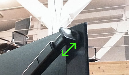 Bleibt das eigentliche Tuch: Es ist leicht dehnfähig und zeigt in jeder Ecke eine Öse, die in dem mittlerweile von uns aufgebauten Trägerkreuz eingehängt werden soll. Bei genauer Betrachtung fällt auf, dass die Haltehaken des Kreuzes federnd gelagert sind und mit dem Daumen eingedrückt werden können. Dies erleichtert den Aufbau und sorgt für eine höhere Tuchspannung.