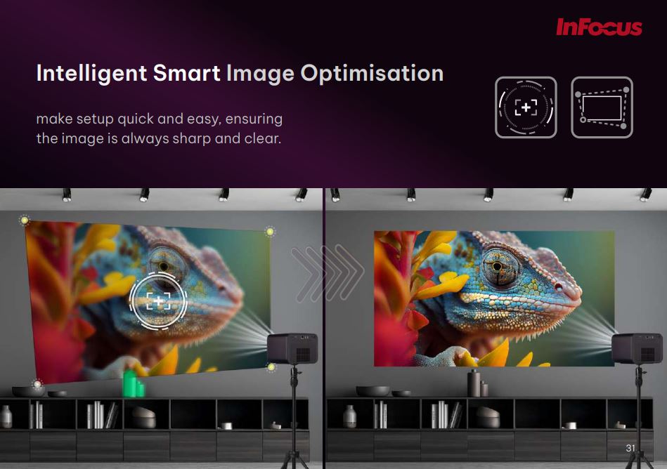 Dieser Beamer ist mit hochmodernen Auto Image Smart Sensors ausgestattet, die das Bild automatisch korrigieren, fokussieren und an die Projektionsfläche anpassen. Nie wieder kompliziertes Justieren! Die mühsame manuelle Einrichtung entfällt komplett. Sie stellen den Beamer einfach hin, und er sorgt in Sekundenschnelle selbst für ein perfekt kalibriertes, rechteckiges und scharfes Bild.
