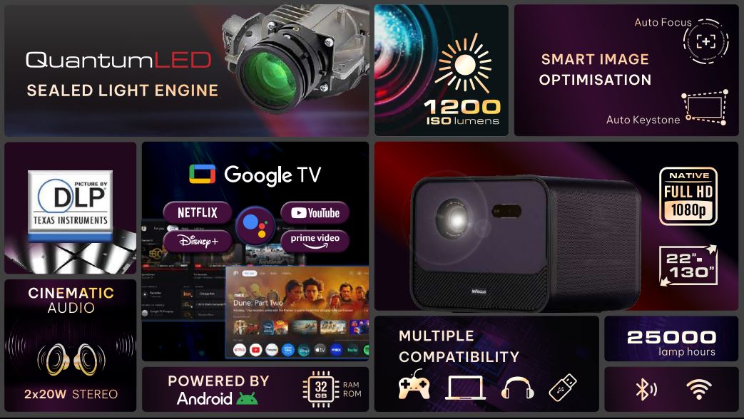 Der InFocus Crusader Grandmaster ist die perfekte Kombination aus Qualität und modernster Smart-Technologie. Er liefert nicht nur beeindruckende native Bilder und satten Sound, sondern garantiert dank der langlebigen LED-Lichtquelle und den automatischen Smart-Sensoren langfristigen, wartungsfreien Filmgenuss.