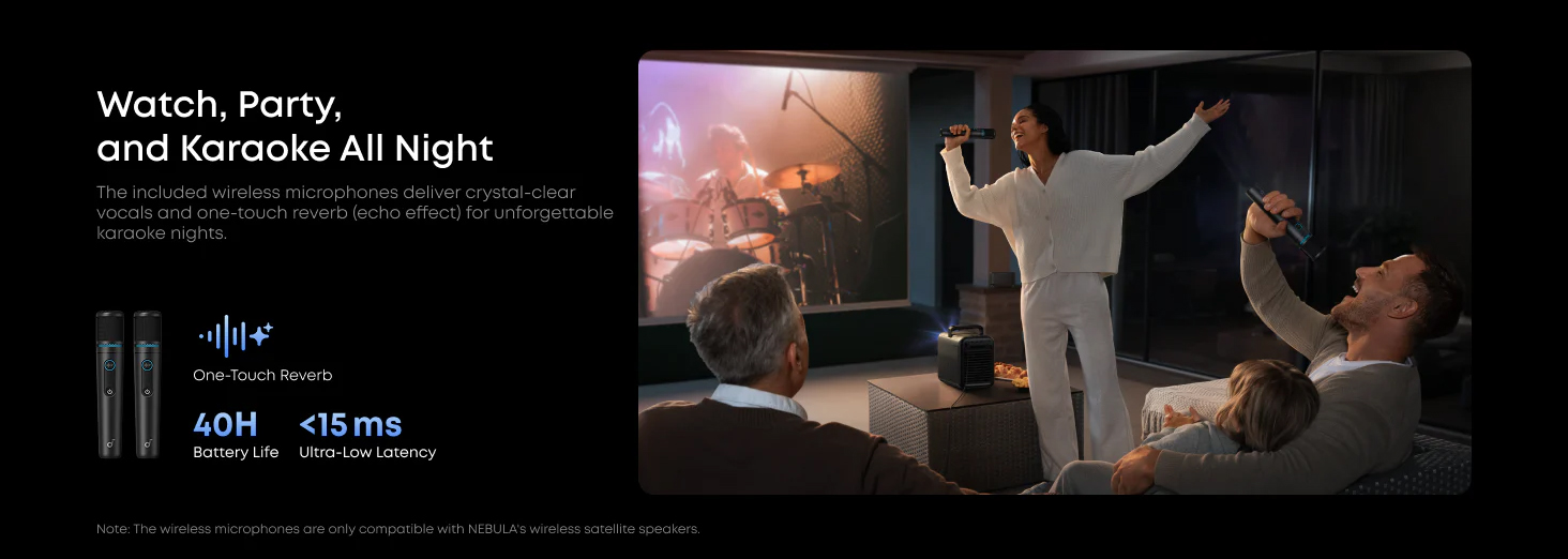 - Optimale Abstimmung: Die kabellosen Satellitenlautsprecher sind speziell für den NEBULA X1 Beamer konzipiert. Die kabellosen Mikrofone sind mit den NEBULA Satellitenlautsprechern kompatibel, um eine einfache Nutzung zu gewährleisten.