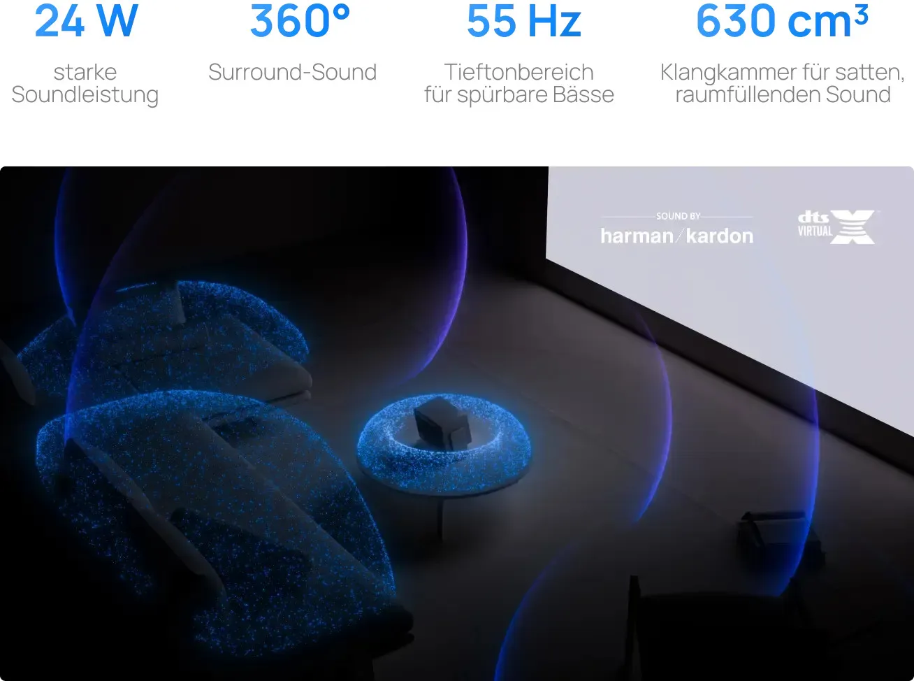 Für anspruchsvolle Gamer ist der HORIZON 20 eine hervorragende Wahl. Er dominiert das Spiel auf einer Leinwand von bis zu 200 Zoll dank einer reaktionsschnellen Eingabeverzögerung von nur 1ms Input Lag und einer hohen Bildwiederholrate von 240Hz. Die Unterstützung von VRR und ALLM sorgt für ein ruckelfreies und verzögerungsfreies Spielerlebnis ohne Qualitätseinbußen. Spezielle Gaming-Modi, wie der FPS-Modus und die Schatten-Optimierung, bieten taktische Vorteile und machen versteckte Details sichtbar. Über das leistungsstarke MT9679 SoC und den großzügigen 4GB RAM profitieren Sie nicht nur beim Gaming von einer stabilen Performance. Auch das integrierte Google TV-Betriebssystem läuft flüssig und bietet direkten Zugriff auf alle wichtigen Streaming-Apps wie Netflix und Prime Video. Abgerundet wird das Erlebnis durch die integrierten Harman Kardon Lautsprecher. Diese liefern satten 360°-Surround-Sound mit spürbaren Bässen, sodass externe Lautsprecher oft überflüssig werden.