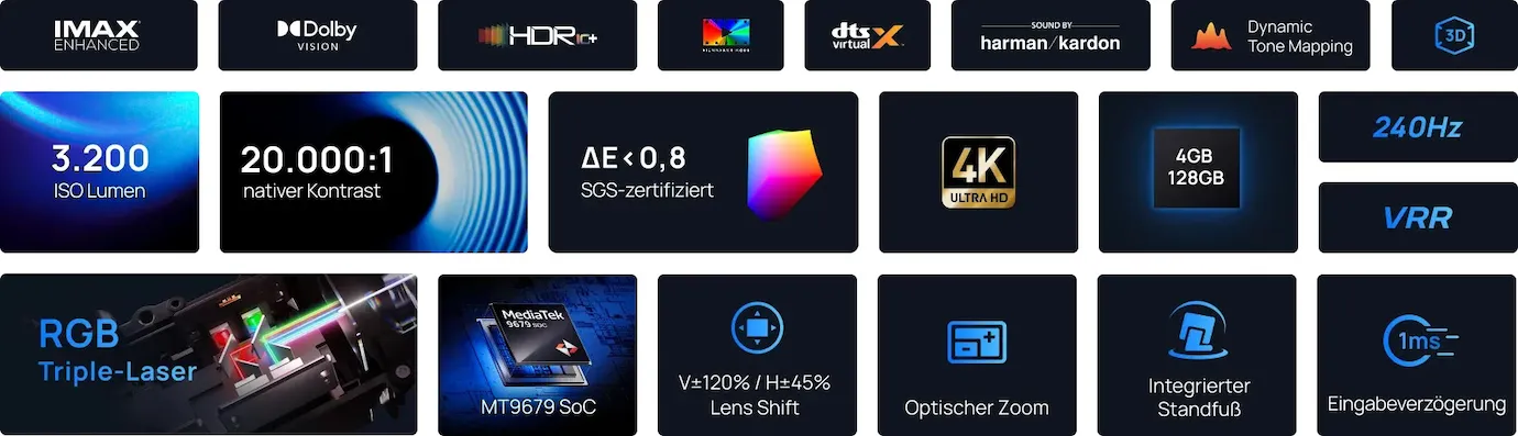 • RGB Triple-Laser Technologie: Professionelle Farbtreue (ΔE<0,8) dank SGS-zertifiziertem RGB Triple-Laser für reine, natürliche Farben.